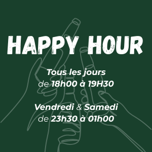 Profitez de nos Happy Hours tous les jours de 18h à 19h30 pour bien démarrer la soirée, et en bonus, les vendredi et samedi de 23h30 à 1h pour prolonger le plaisir !